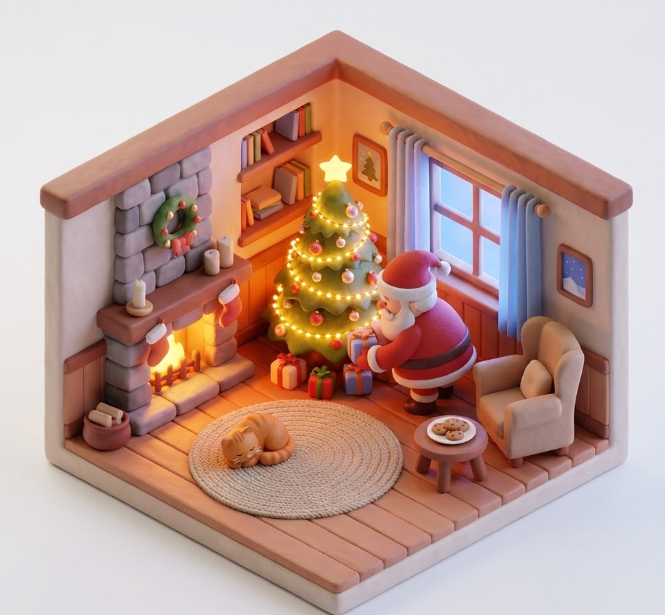 A cute 3D rendered isometric Christmas living room cutaway. Santa Claus is placing gifts under a glowing tree. A sleeping cat on the rug. Warm orange and blue lighting, Pixar style, C4D, Blender render, clay material, soft edges, joyful atmosphere, white background --ar 1:1Prompt Option B: The Reindeer Character