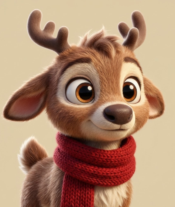 A close-up 3D character design of a baby reindeer wearing a red scarf, big expressive eyes, fluffy texture, soft studio lighting, Disney animation style, 8k resolution, solid color background --ar 1:15. Advanced Prompting Tips: How to Refine Your Results