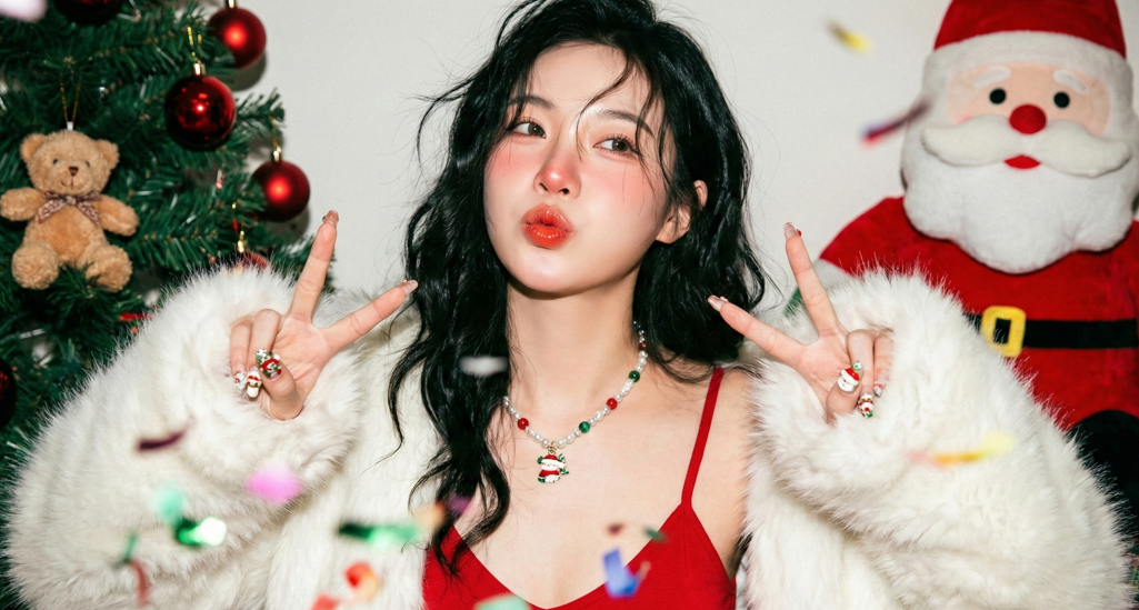 A candid direct flash photograph of a beautiful young woman at a lively Christmas party. She is wearing a red spaghetti strap top under a thick, fluffy white faux fur coat. Her hair is black, loose, with messy water ripple waves. She has pink blush, reddish-orange glossy lips, and fair skin. She is making double peace signs with a happy, pouting expression, head pushed back playfully. Background: A huge Santa Claus plush toy and a decorated tree with red ornaments. Falling colorful confetti with motion blur. Vintage film aesthetic, Y2K style, film grain, noise, vibrant red and green colors --ar 2:3Prompt Option B: The Winter Prince (Male Portrait)