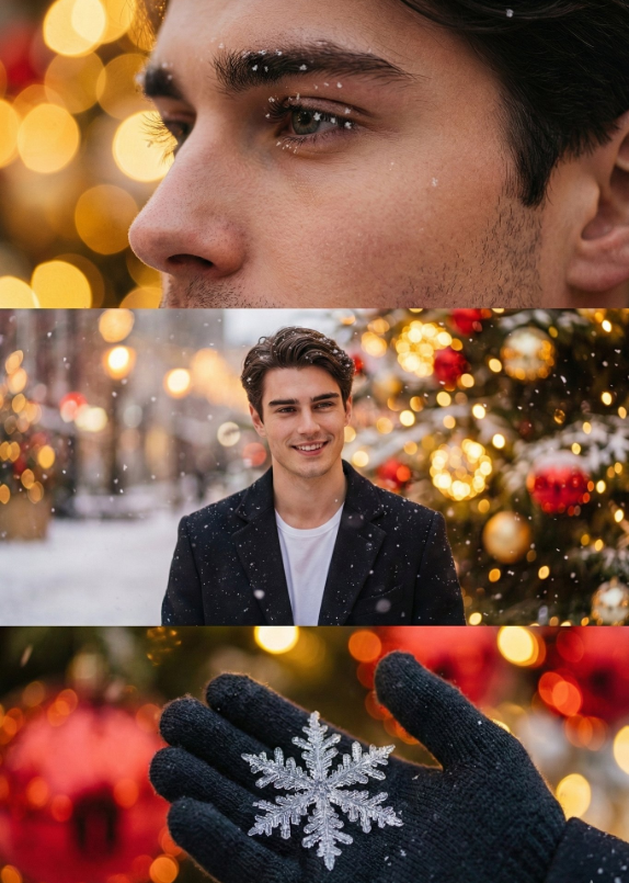 A cinematic mid-shot of a handsome young man standing in soft snowfall, wearing stylish winter clothes. Magical holiday feel with warm golden Christmas bokeh and glowing ornaments in the background. Ultra-detailed textures, snowflakes lying on his eyelashes. Dreamy festive mood, red-gold color grading, shallow depth of field, ultra-filmic lighting --ar 2:34. 3D & Animation Style (Pixar & Disney Vibes)