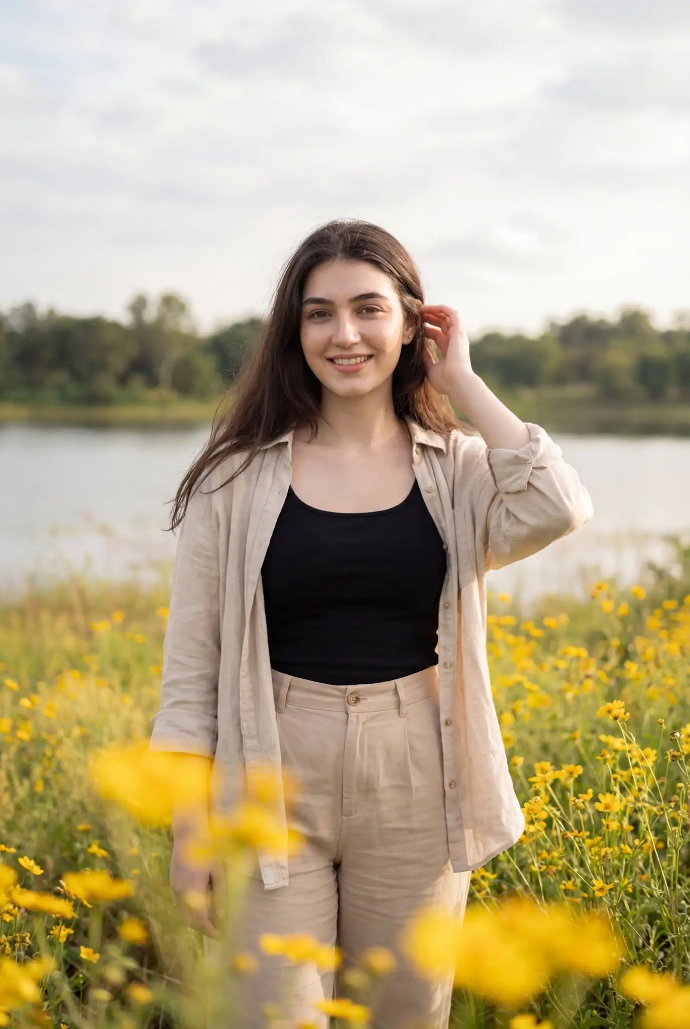 "finger_positions": "Right hand: index finger slightly extended, remaining fingers softly curled. Left hand: fingers draping naturally over the knee, relaxed curve.",