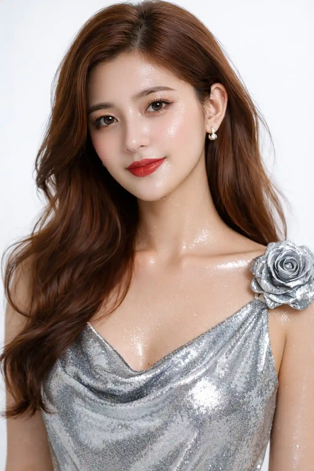 "contrast": "cool silver dress vs warm hair and lip"